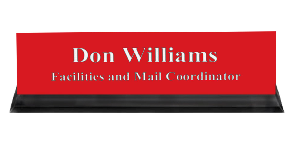 Crimson Plastic Plate with White Text, Black Acrylic Deskplate