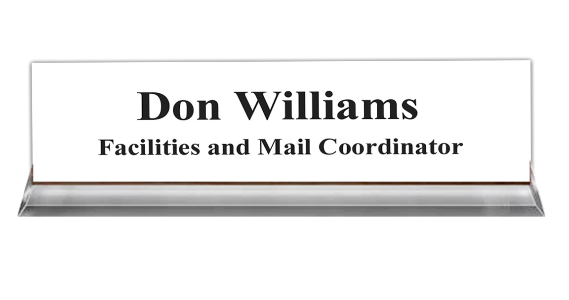 White Plastic Plate with Black Text, Clear Acrylic Base